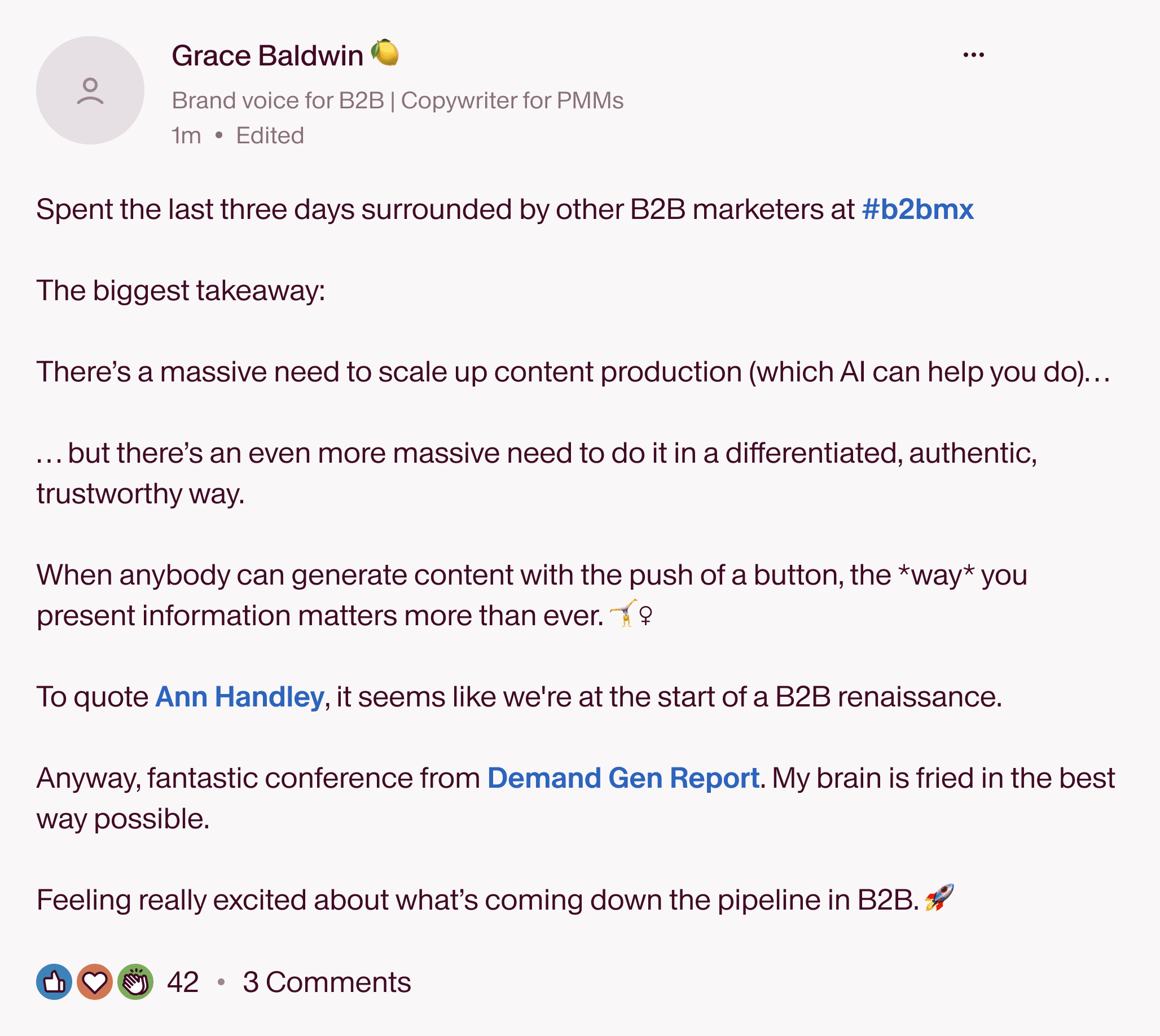 How do I know? Because content queen, word maven, and editorial empress Ann Handley said so at B2BMX, and B2B copy whiz Grace Baldwin agreed.