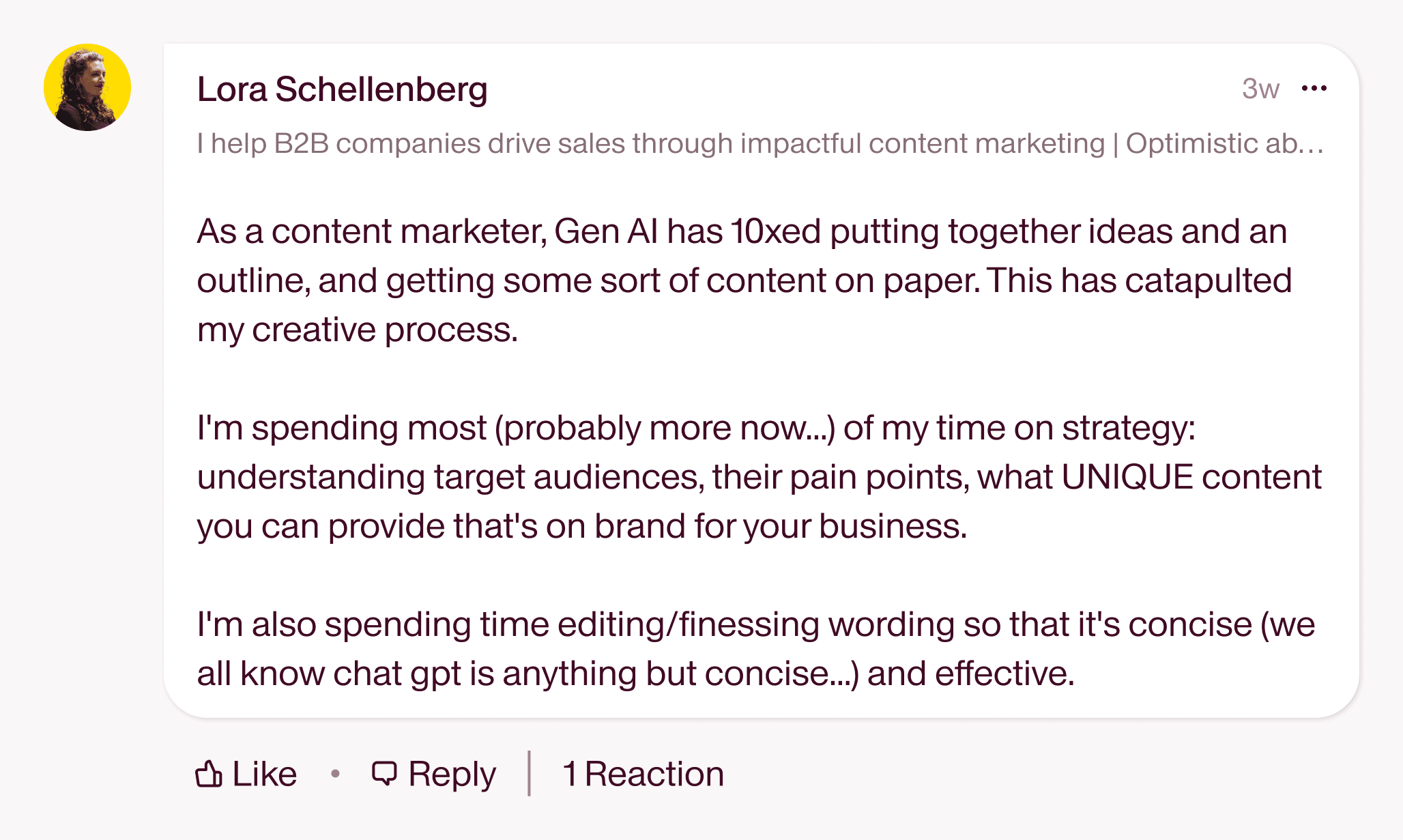 As Lora Schellenberg, Founder of Just Citrus, says, "Gen AI has 10xed putting together ideas and an outline, and getting some sort of content on paper. This has catapulted my creative process. I'm spending most of my time on strategy: understanding target audiences, their pain points, what UNIQUE content you can provide that's on brand for your business." It's about setting the foundation first, then building on it.